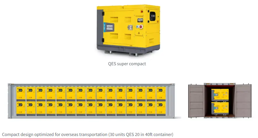 नवोन्मेषी सुपर कॉम्पैक्ट क्यूईएस मॉडल को सबसे कुशल परिवहन प्रदान करने के लिए डिज़ाइन किया गया है। आप 40 फीट के कंटेनर में एटलस कोप्को क्यूईएस 20 की 30 यूनिट तक फिट कर सकते हैं, जो बाजार में 20kVA पावर एटलस जेनरेटर के लिए सबसे अधिक है! इसका मतलब है अनुकूलित परिवहन, कम CO2 उत्सर्जन और परिचालन लागत, जिसके परिणामस्वरूप स्वामित्व की कुल लागत (TCO) कम होती है। इसका पर्यावरण अनुकूल डिज़ाइन इसे विदेशों में भंडारण के लिए आदर्श बनाता है, जिससे साइट पर आपके पदचिह्न में तेजी से कमी आती है।