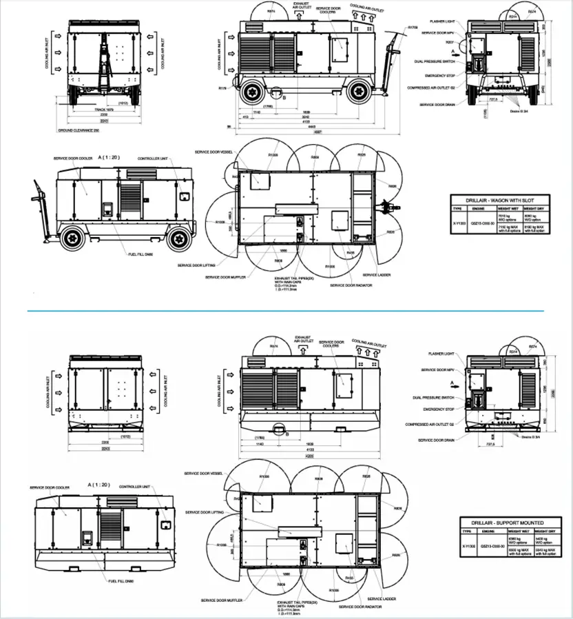 इकाई में दो उच्च कुशल कंप्रेसर तत्व, डीजल इंजन, कूलिंग, वायु/तेल पृथक्करण और नियंत्रण प्रणालियाँ शामिल हैं - सभी एक ध्वनि-रोधी पावर लेपित स्टील बाड़े के भीतर संलग्न हैं।
