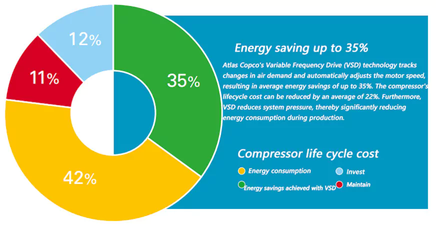 ऑयल-फ्री स्क्रू एयर कंप्रेसर की कुल जीवनचक्र लागत में ऊर्जा की खपत 80% से अधिक है। इसके अलावा, संपीड़ित वायु उत्पादन में उपयोग की जाने वाली बिजली किसी कारखाने की कुल बिजली लागत का 40% से अधिक होती है। ऊर्जा लागत को कम करने के लिए, एटलस कोप्को ने संपीड़ित वायु उद्योग में वेरिएबल फ़्रीक्वेंसी ड्राइव (वीएसडी) तकनीक का बीड़ा उठाया है। वीएसडी न केवल महत्वपूर्ण मात्रा में ऊर्जा बचाता है बल्कि भावी पीढ़ियों के लिए पर्यावरण की भी रक्षा करता है। इस तकनीक में निरंतर निवेश के लिए धन्यवाद, एटलस कोप्को बाजार में एकीकृत वीएसडी कम्प्रेसर की व्यापक रेंज की पेशकश करने में सक्षम है।