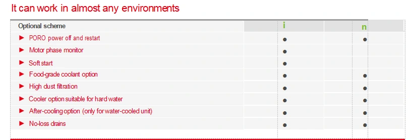 हमारे कंप्रेसर खाद्य-ग्रेड शीतलक, उच्च धूल निस्पंदन और कठोर जल कूलर और कठोर वातावरण के लिए अनुकूलित अन्य विकल्प प्रदान करते हैं, जो आपकी कई अनुप्रयोग आवश्यकताओं को पूरा कर सकते हैं।