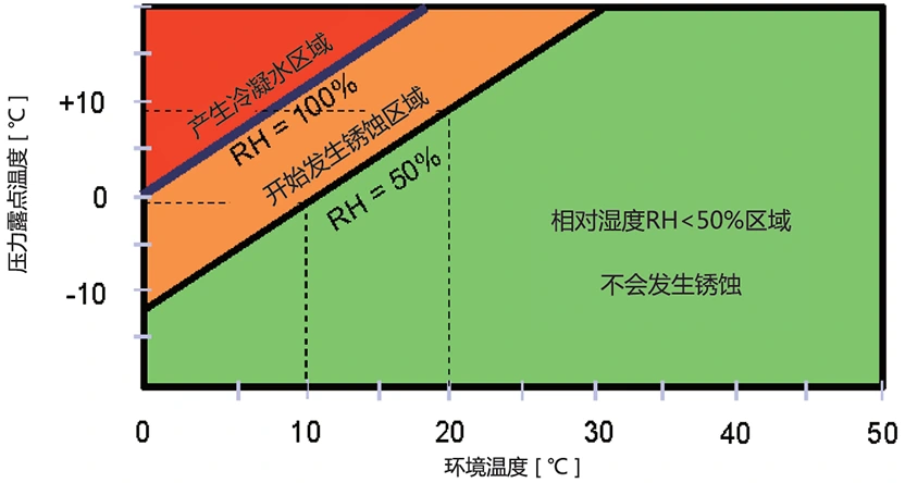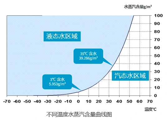 चित्र से पता चलता है कि हवा अलग-अलग तापमान पर अलग-अलग मात्रा में जलवाष्प रखती है। हवा ठंडी हो जाती है और उसका जलवाष्प स्तर भी कम हो जाता है। वक्र में ऐसे बिंदु हैं जो संतृप्त जल वाष्प के स्तर को चिह्नित करते हैं। इनमें से प्रत्येक बिंदु का तापमान ओस बिंदु है। कम ओस बिंदु का अर्थ है संपीड़ित हवा में कम जल वाष्प। रेफ्रिजरेटेड एयर ड्रायर इस भौतिक नियम का उपयोग करते हैं। वे संपीड़ित हवा को रेफ्रिजरेंट के साथ गर्म होने देते हैं। यह क्रिया संपीड़ित हवा के तापमान को नीचे लाती है। ठंडी हवा का जलवाष्प तरल पानी में बदल जाता है। यह तरल सिस्टम से बाहर निकल जाता है। उदाहरण के लिए, 35℃ पर संपीड़ित हवा की संतृप्त जल वाष्प सामग्री 39.286 ग्राम/घन मीटर है। रेफ्रिजरेंट के साथ ताप विनिमय और 3℃ तक ठंडा होने के बाद, संतृप्त जल वाष्प की मात्रा 5.953g/m³ है। 33.333g/m³ का अंतर फ़्रीज़ ड्रायर द्वारा शीतलन और निर्जलीकरण के बाद निकाले गए पानी की मात्रा को इंगित करता है। कहने का तात्पर्य यह है कि, संपीड़ित हवा फ्रीज ड्रायर से गुजरने के बाद, लगभग 85% नमी हटा दी जाती है, जिससे यह सुनिश्चित हो जाता है कि संपीड़ित हवा का सूखना उत्पादन प्रक्रिया की आवश्यकताओं को पूरा करता है।