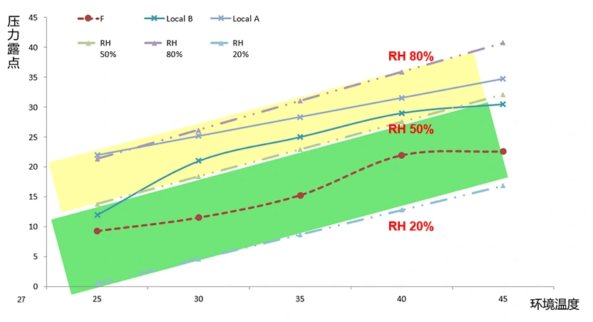 जैसा कि नीचे मापे गए डेटा में दिखाया गया है, 7 बार के संपीड़ित वायु प्रवेश दबाव, 35 डिग्री सेल्सियस के इनलेट तापमान, 7 डिग्री सेल्सियस के दबाव ओस बिंदु और 25 डिग्री सेल्सियस के अंतिम निकास तापमान के साथ, हवा की सापेक्ष आर्द्रता 30% है, जो पाइपलाइनों और वायु का उपयोग करने वाले उपकरणों के क्षरण को प्रभावी ढंग से रोकती है।